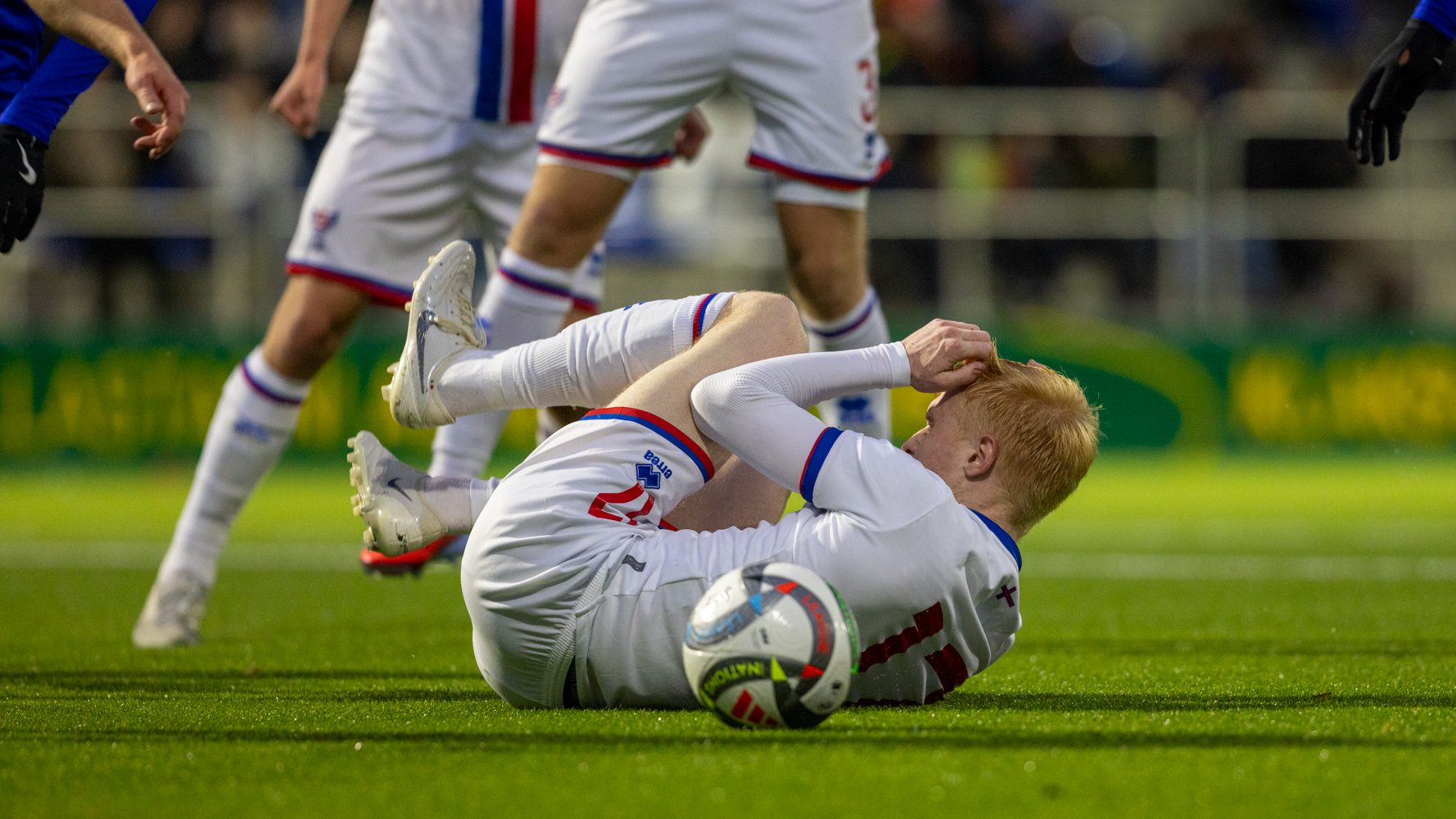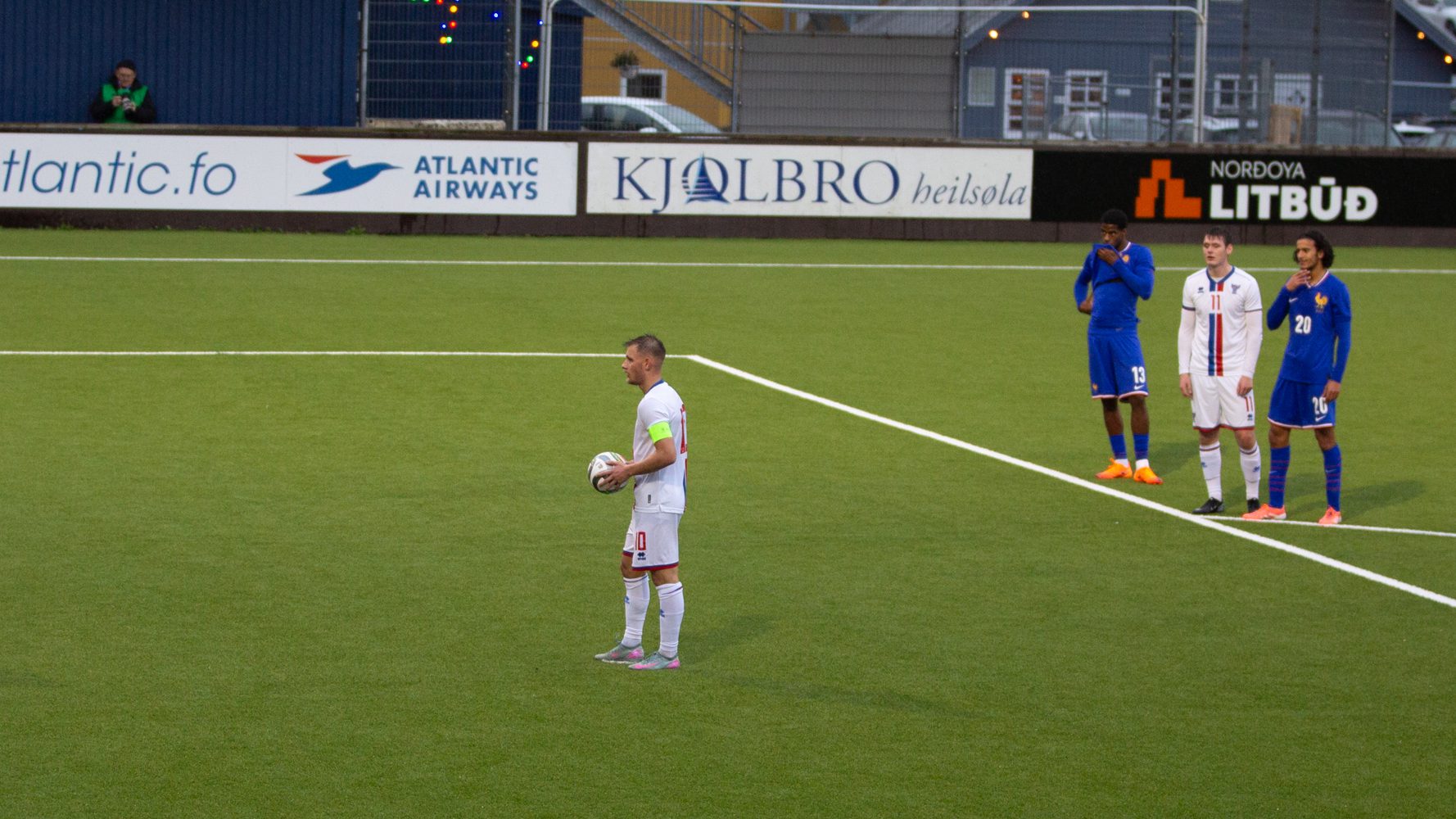Føroyar fingu annars ein gyltan møguleika at koma á máltalvuna tá ein hálvur tími var spældur. Finski dómarin floytaði fyri brotssparki til Føroyar, sum Áki Samuelsen var settur at taka sær av. Men franski málverjin bjargaði, og nærri komu okkara ikki.